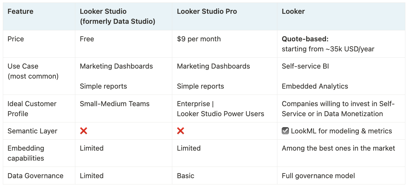 aren’t sure what the differences are between Looker Studio and Looker (the original, semantic-layer BI platform).